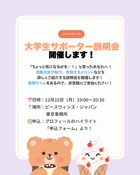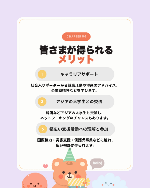 国際協力・災害支援・保護犬事業などに触れ、広い視野が得られます。