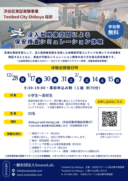 飛行機や空港の環境が苦手なお子様のために、イマーシブ(没入型)空間を使って擬似的に空港利用を体験していただくプログラムです。今回はその運営をサポートしてくださる学生ボランティアを募集します。