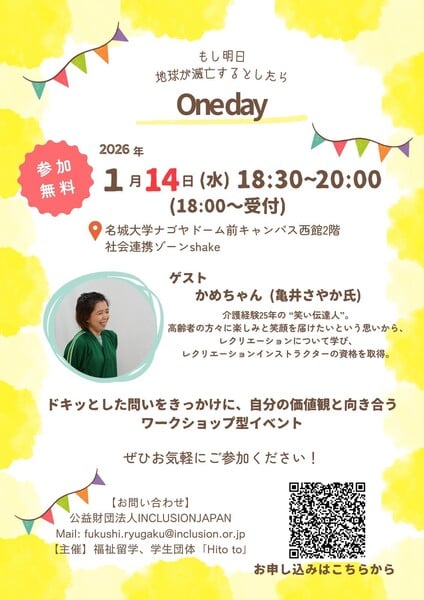 2026年1/14(水)18時30分-20時、名城大学ナゴヤドーム前キャンパス西館2階、社会連携ゾーンshakeにて、イベントを開催します。運営スタッフは17時集合、20時30分解散になります。 |